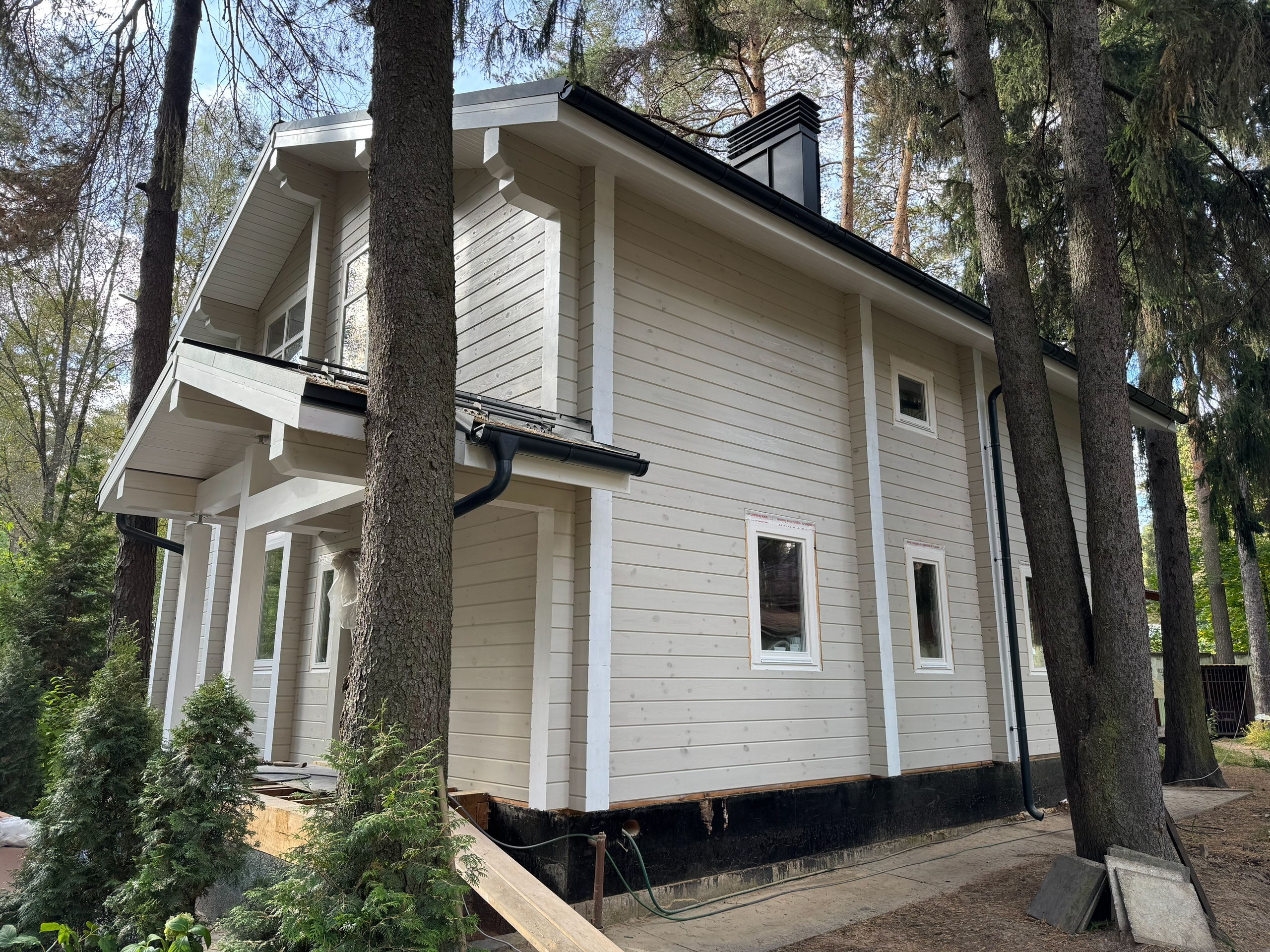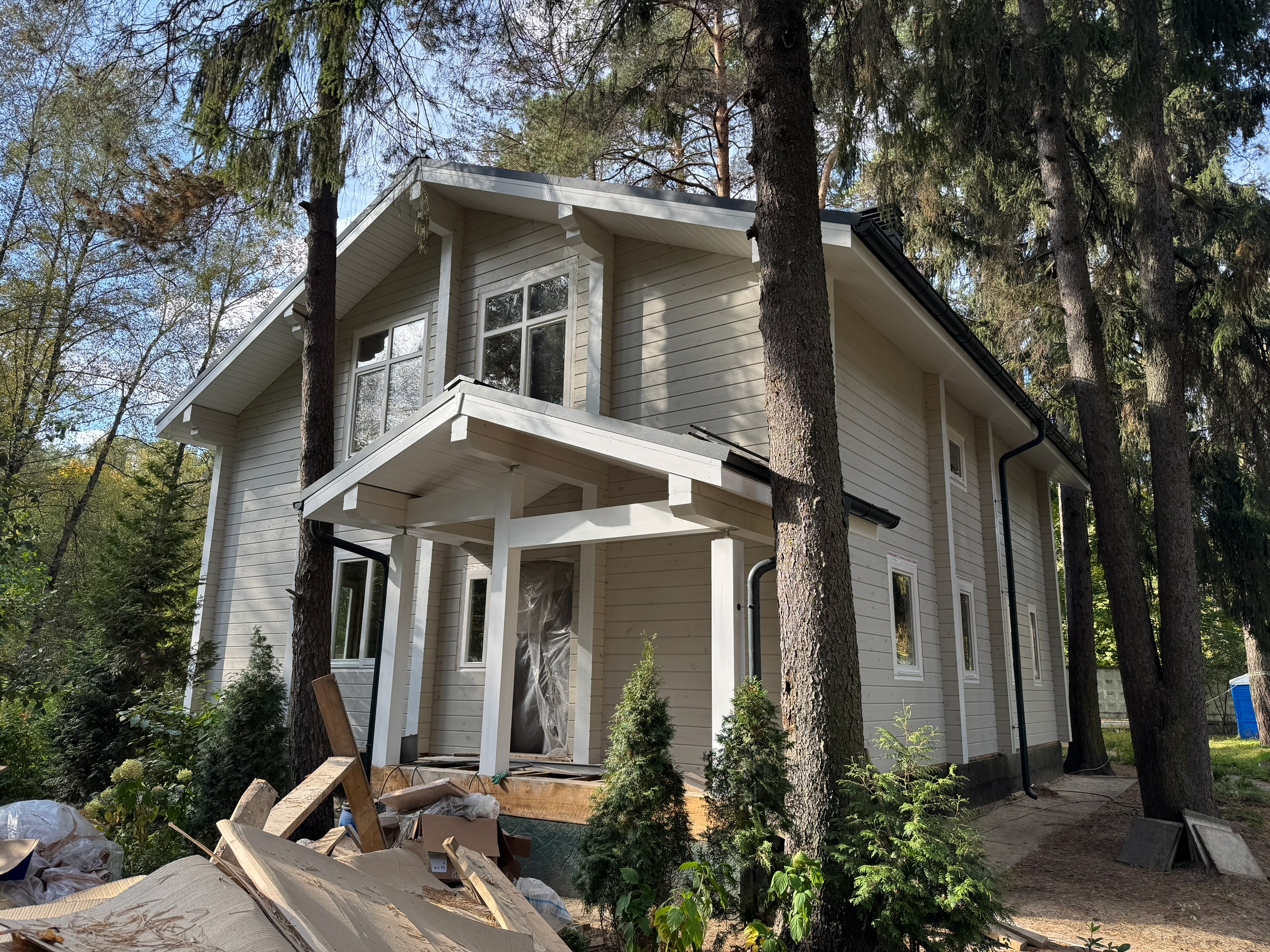 Это полностью индивидуальный проект нашего заказчика. Общая площадь дома составляет 186,85 квадратных метров. В строительстве мы использовали клееный брус собственного производства из сосны сечением 205х185 мм.