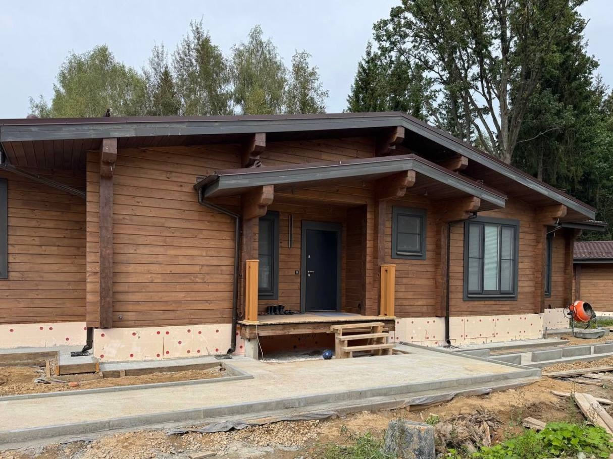 Выполнили заливку отмостки и дорожек. Дом построен по нашему типовому проекту Анси с индивидуальными изменениями планировки.