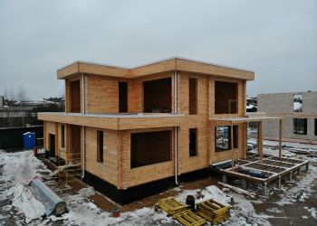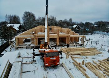 Наша бригада завершает работы по сборке сруба дома. Далее мы приступим к монтажу стропильной системы. В строительстве мы используем клееный брус собственного производства из сосны сечением 205х270(h) мм. Общая площадь дома составляет 424,61 м2. За основу проекта был взят наш типовой проект Турин, но заказчик внес свои индивидуальные изменения.