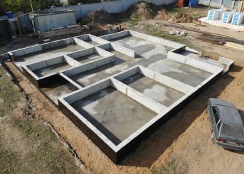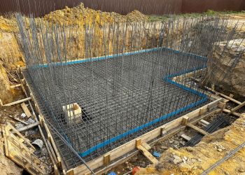 Наша бригада завершила заливку фундамента. Дальше мы приступим к сборке сруба. Дом будет построен из клееного бруса из сосны сечением 205х185 мм. Это полностью индивидуальный проект нашего заказчика. Общая площадь дома составляет 426,98 квадратных метров.