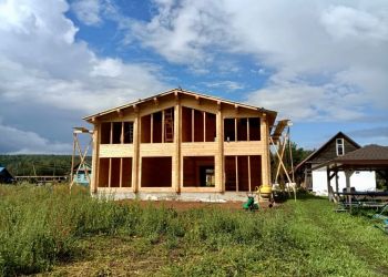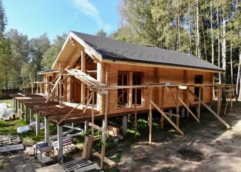 Сейчас наша бригада ведет работы по монтажу кровельного пирога. В строительстве мы использовали клееный брус собственного производства из сосны с сечением 205х185 мм. Это индивидуальный проект нашего заказчика. Общая площадь дома составляет 230 квадратных метров.
