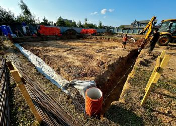 Сейчас наша бригада приступила к работам по устройству фундамента дома. Дом будет построен из клееного бруса из сосны с сечением 205х185 мм. Это полностью индивидуальный проект нашего заказчика. Общая площадь дома составляет 426,98 квадратных метров.