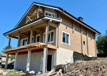 В строительстве мы используем клееный брус собственного производства из сосны с сечением 205х185 мм. Это индивидуальный проект нашего заказчика. Общая площадь дома составляет 230 квадратных метров.