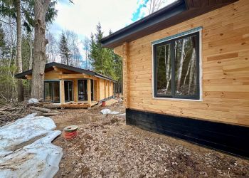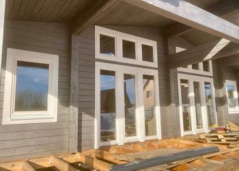 На этом объекте дом построен по типовому проекту Анси с индивидуальными изменениями планировки. Также на участке расположились баня и гараж. В строительстве дома мы использовали клеенный брус из сосны собственного производства. Для финального покрытия была выбрана металлочерепица. Также установили наши деревянные окна из сосны.
