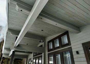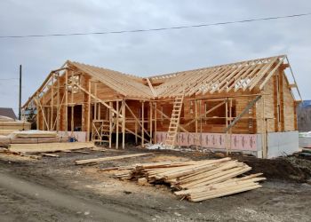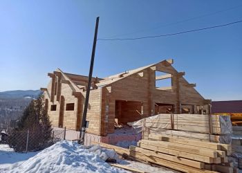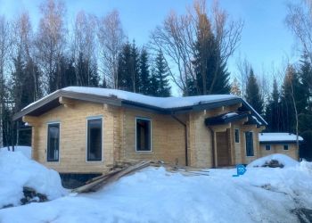В строительстве мы используем клееный брус собственного производства из лиственницы с сечением 185х245 мм. Это полностью индивидуальный проект нашего заказчика. Общая площадь дома составляет 428 квадратных метров.