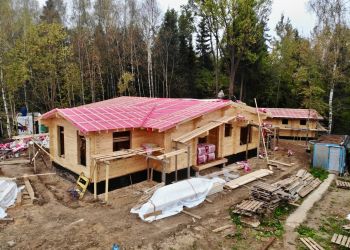 Также наша бригада законсервировала кровлю на зиму. Площадь дома составляет 354 квадратных метра. Всего будет построено 3 здания по индивидуальному проекту нашего заказчика. В строительстве мы используем клееный брус собственного производства из сосны с сечением 185х285 мм.