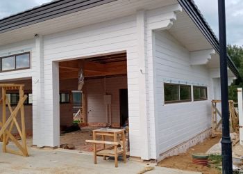 Сейчас наша бригада завершила окрашивание и мы приступаем к внутренним черновым работам.Площадь гаража составляет 70,5 квадратных метров. В строительстве мы использовали клееный брус собственного производства из сосны с сечением 205х185 мм.
