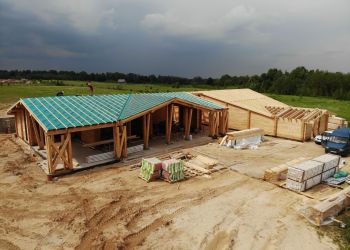 Сейчас наша бригада выполняет работы по сборке сруба дома. Это полностью индивидуальный проект нашего заказчика. Общая площадь дома составляет 186,85 квадратных метров. В строительстве мы будем использовать клееный брус собственного производства из сосны сечением 205х185 мм.