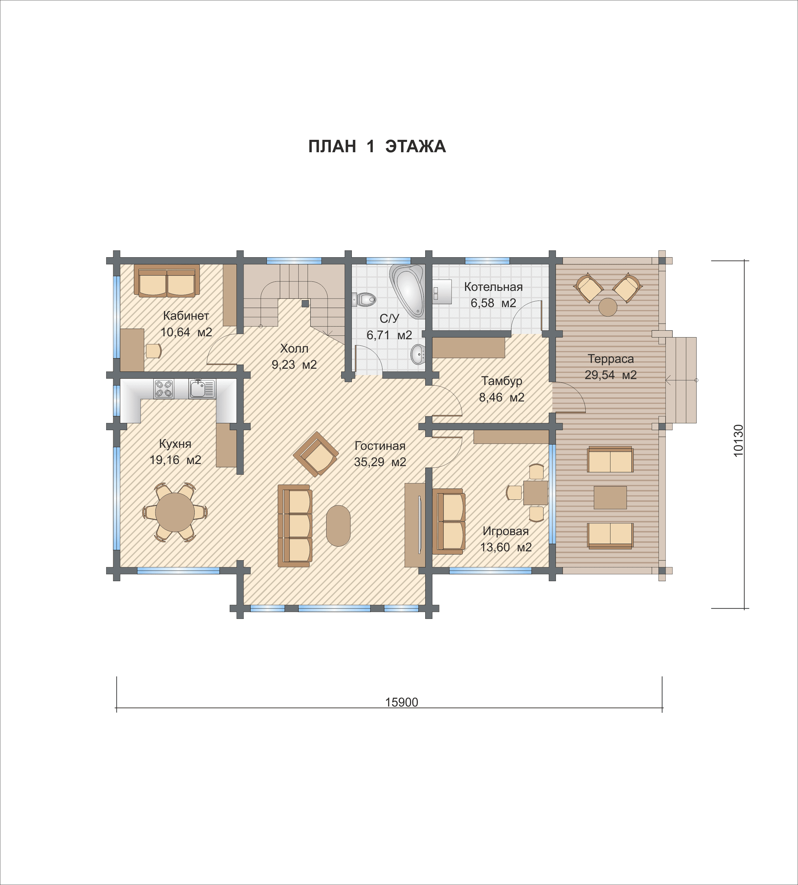 В доме есть большая гостиная, совмещенная с кухней-столовой. На первом этаже есть кабинет и игровая.