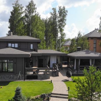 Этот двухэтажный дом с благоустроенной приусадебной территорией создан для комфортной жизни за городом. Как приятно вечером после работы спрятаться от суеты на веранде дома. А в выходные собрать семью и друзей за круглым столом беседки и провести время у открытого огня на костровой площадке в саду.