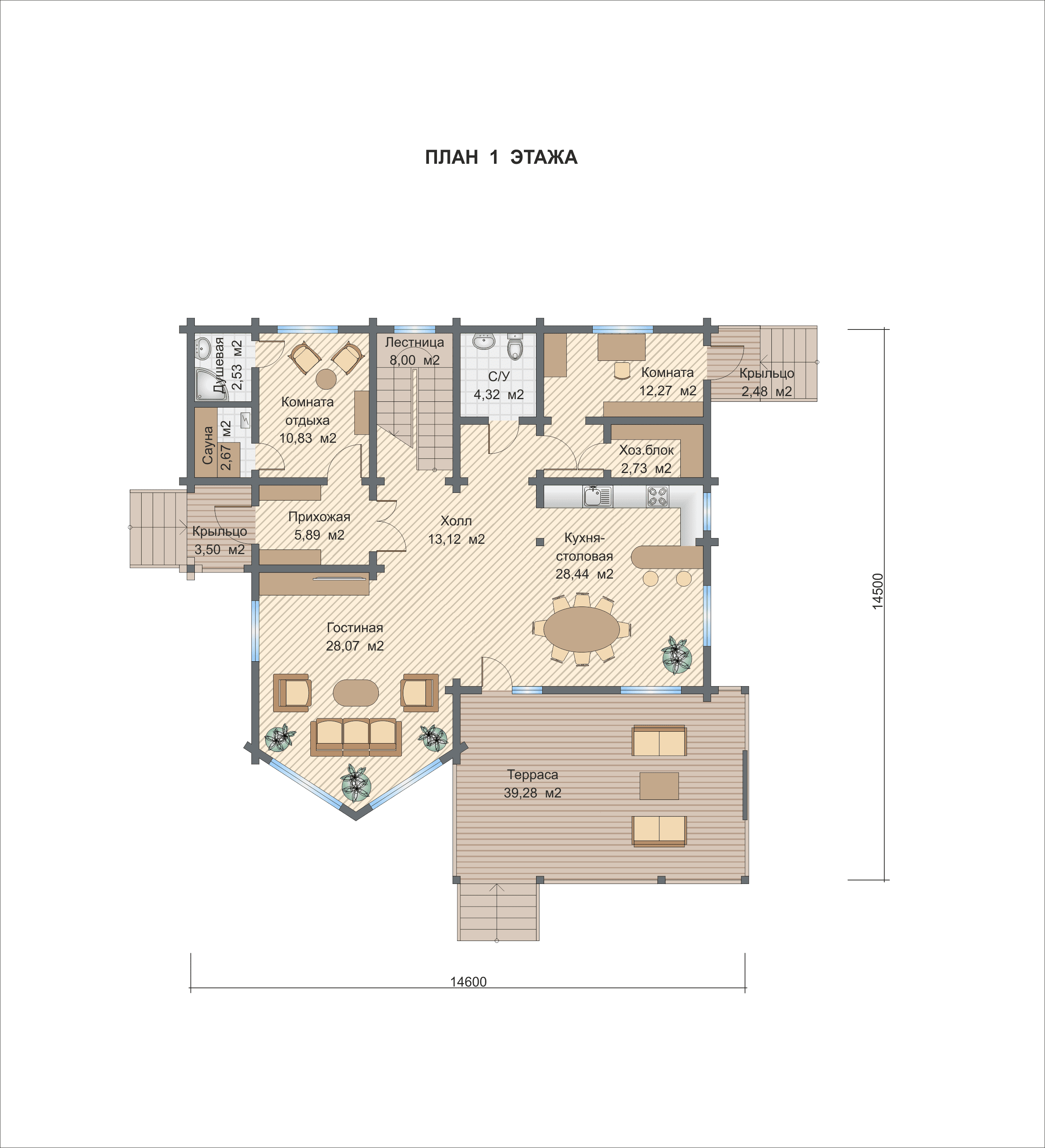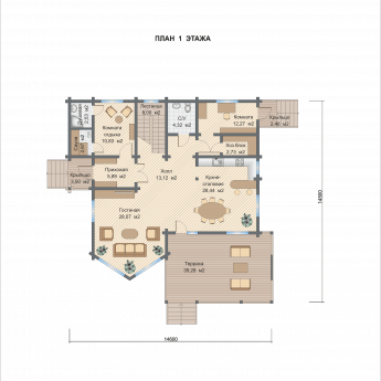 Полезная площадь проекта "Горный Алтай" - 278 кв.м. По проекту "Горный Алтай" - двухэтажное здание, которое также оснащено крыльцом и террасой. Площадь крыльца составляет - 5,98 кв.м., площадь террасы - 39,28 кв.м.