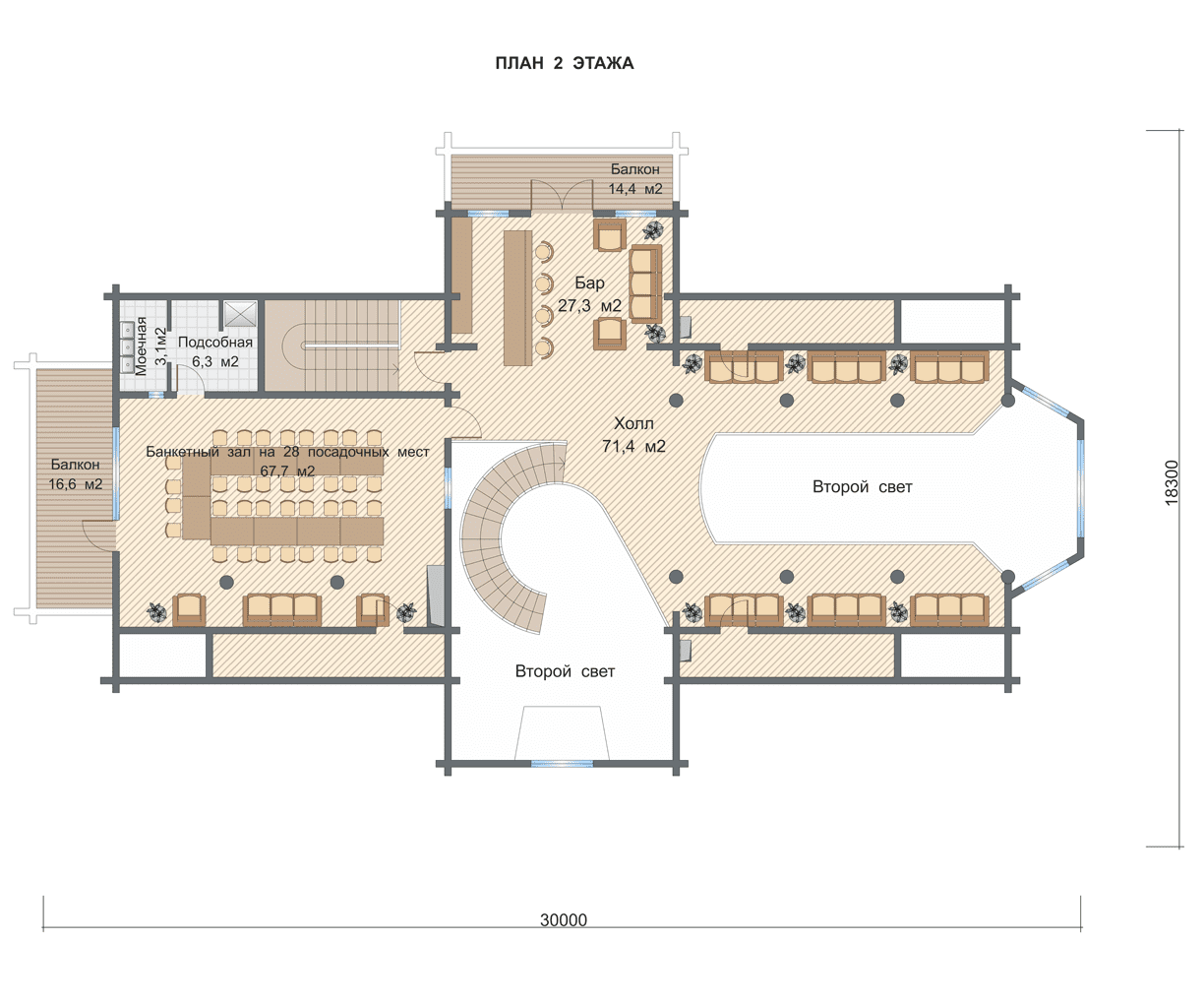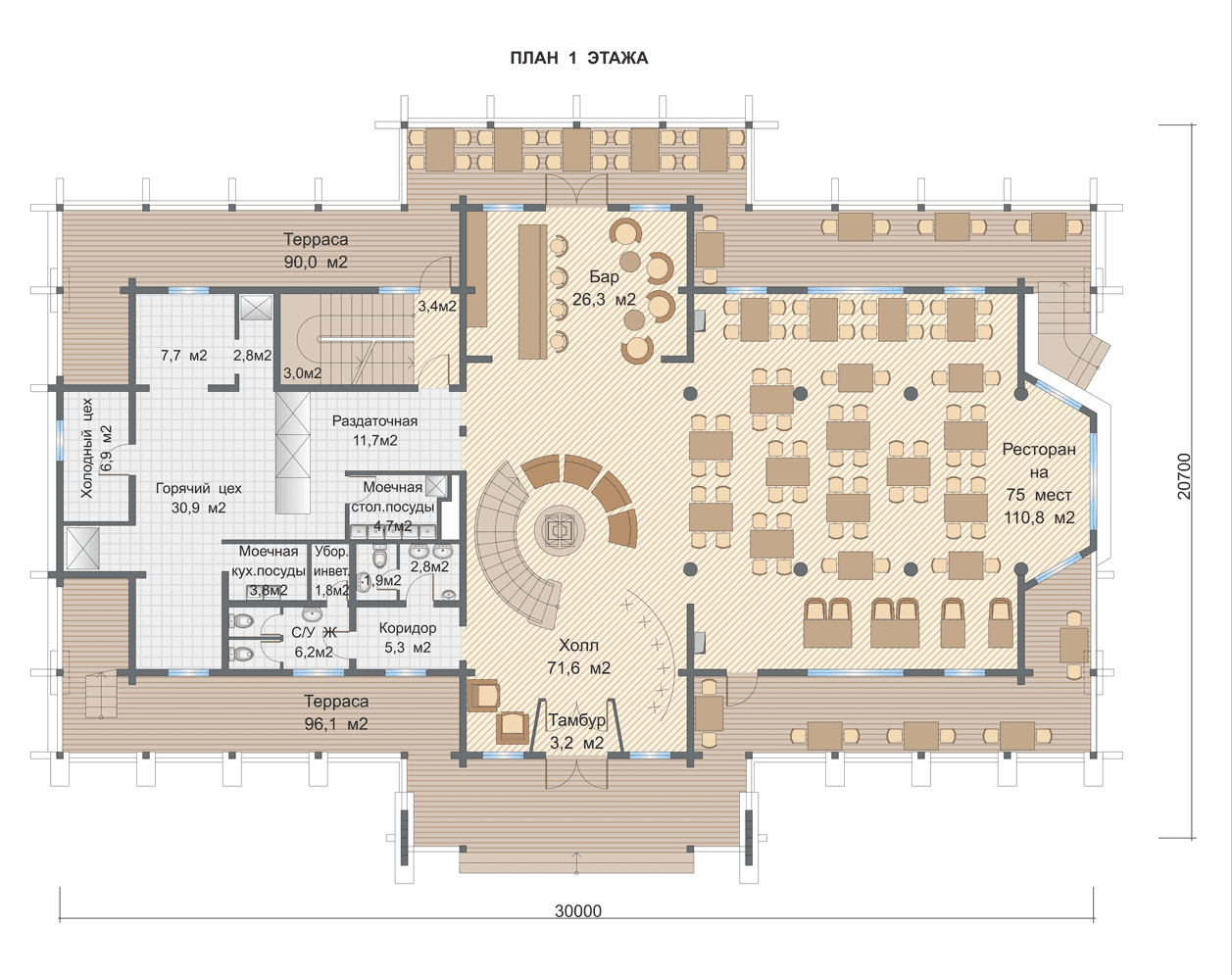 Двухэтажный ресторан из соснового клееного бруса, площадь которого составляет 700 кв. м.