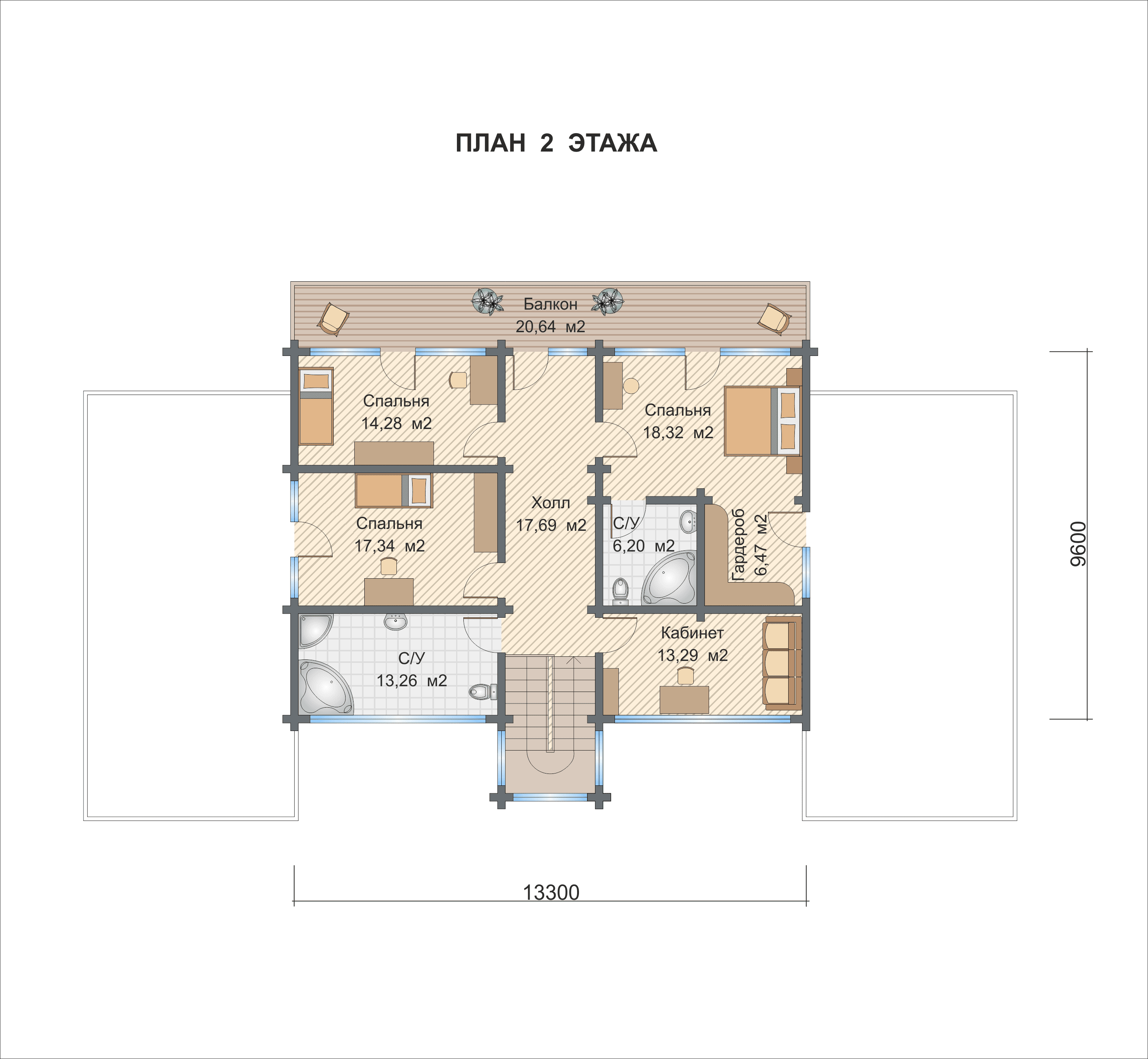 На первом этаже 2 спальни, на втором этаже 4 спальни.