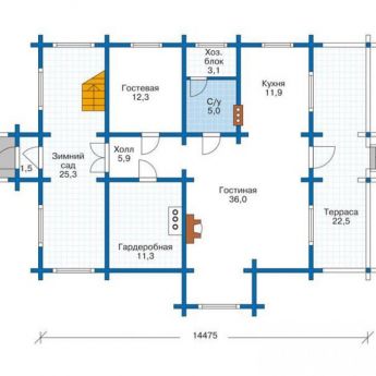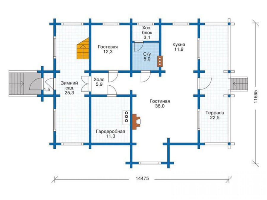 Полезная площадь проекта "Портленд" - 230 кв.м. По проекту "Портленд" - двухэтажное здание, которое также оснащено крыльцом и террасой.Площадь террасы - 22,5 кв.м.