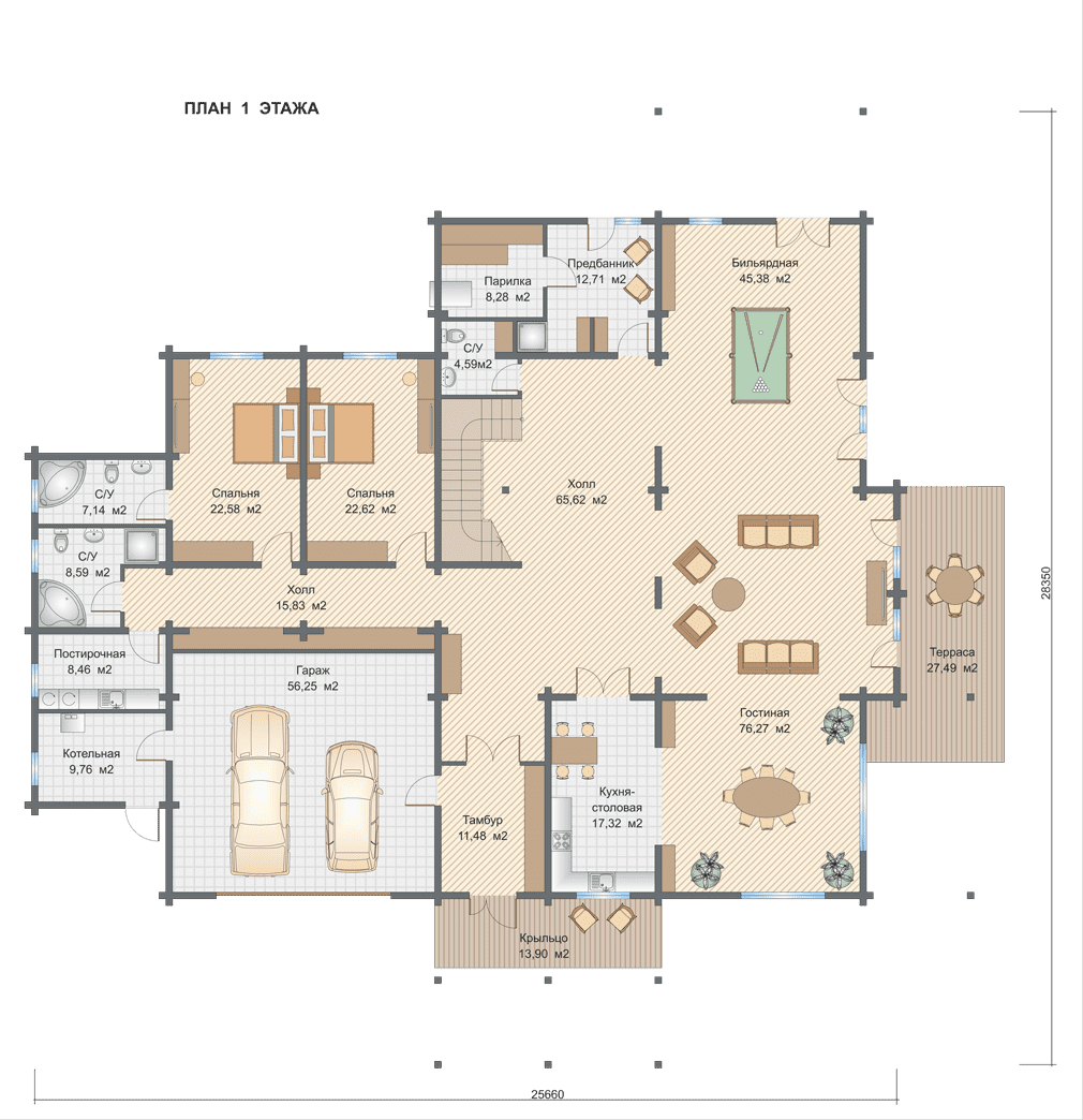 По проекту "Тренто" - двухэтажное здание, которое также оснащено большой гостиной, бильярдной, вторым светом.