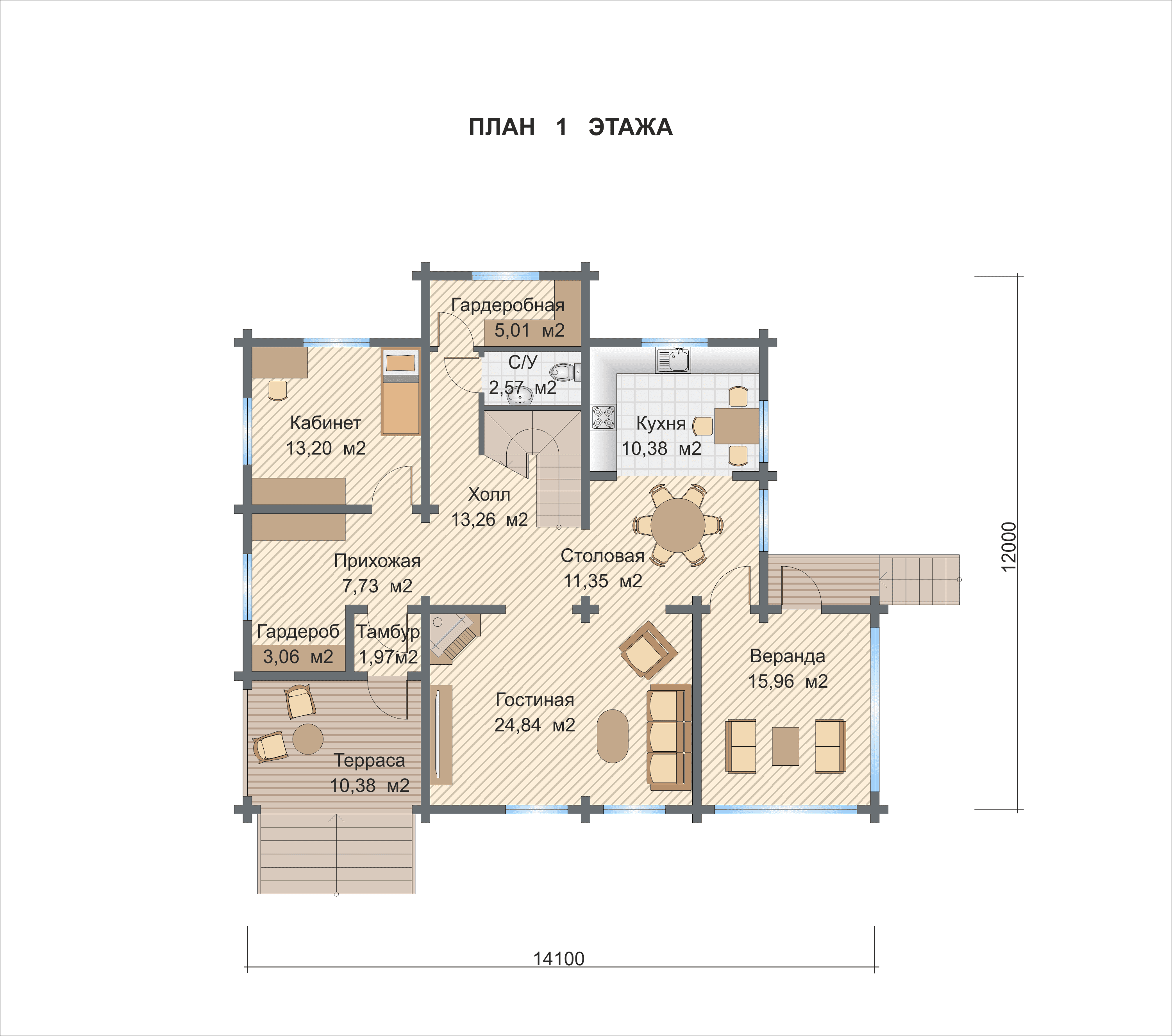 В доме есть большая гостиная, совмещенная с кухней-столовой. На первом этаже есть кабинет и закрытая веранда.