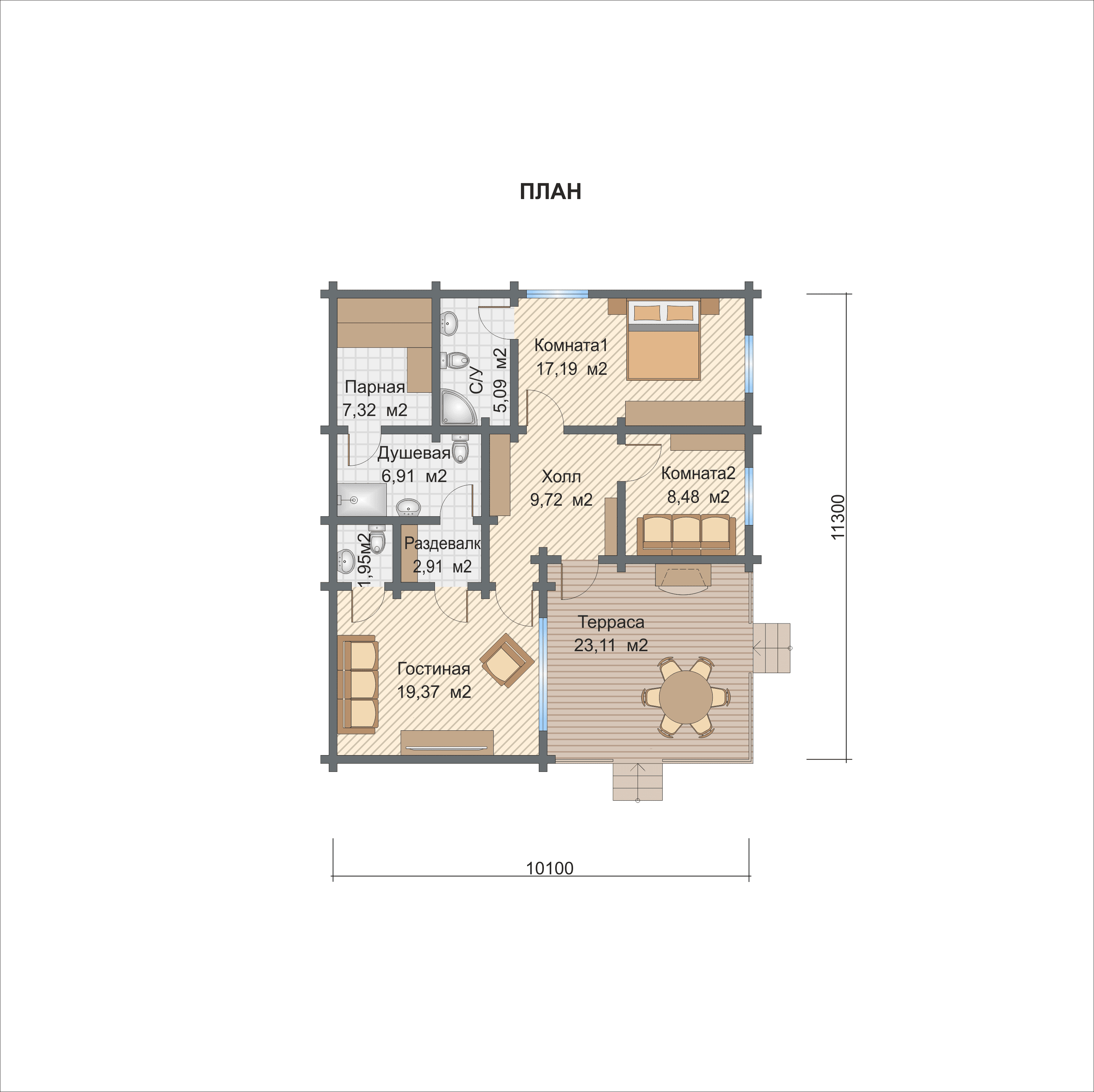 Полезная площадь проекта "Санди" - 102,05 кв.м. По проекту "Санди" - одноэтажное здание, которое также оснащено  и террасой. Площадь террасы - 23,11 кв.м.